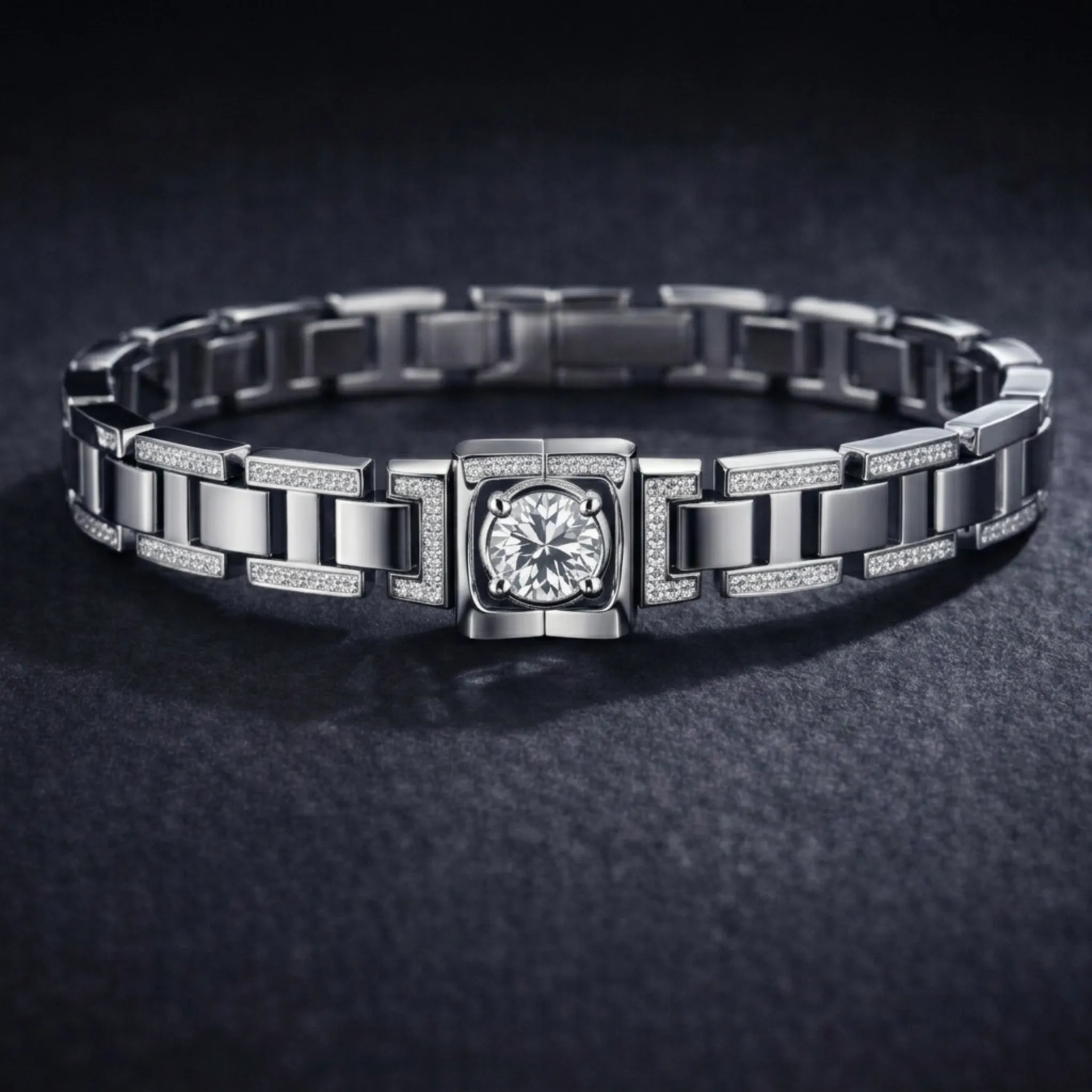 The Axis Bracelet interprets the LX series through sharp geometry and disciplined luxury. Solid 18k white gold creates a deliberate silhouette defined by clean angles and a weight that commands presence. Strategic diamonds offer a subtle contrast to the polished surfaces. This piece functions as a modern signifier of status, engineered for those who prioritize architectural integrity over ornamentation.