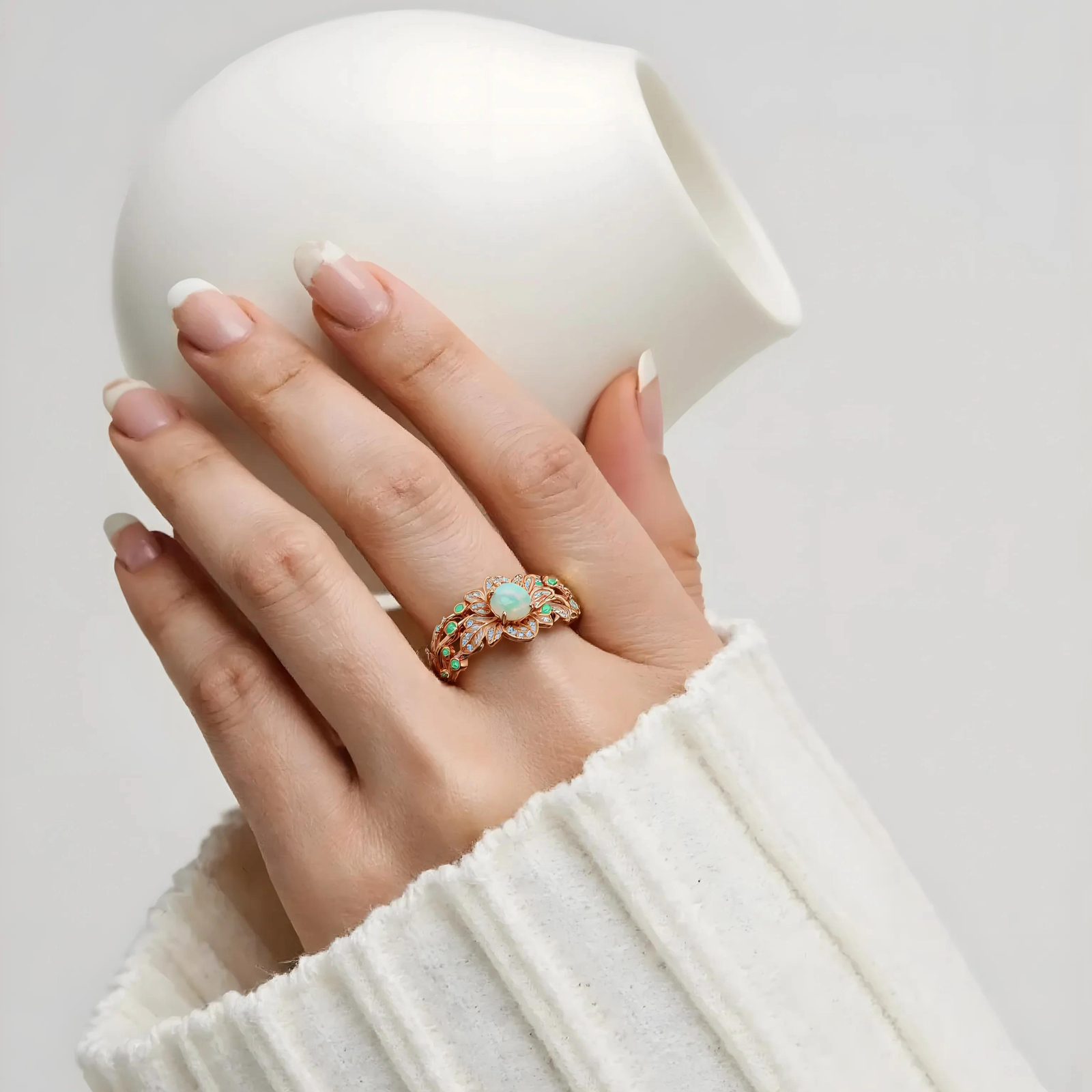 The Enchanted Bloom interprets botanical motifs through a rigorous minimalist lens. Set in 18k rose gold, the architecture centers the iridescent depth of opal against the structural clarity of jade. Brilliant-cut diamonds frame this rare pairing, creating a substantial statement of modern high jewelry. This design is an exercise in textural contrast, engineered for the collector who values unconventional rarity and disciplined luxury.