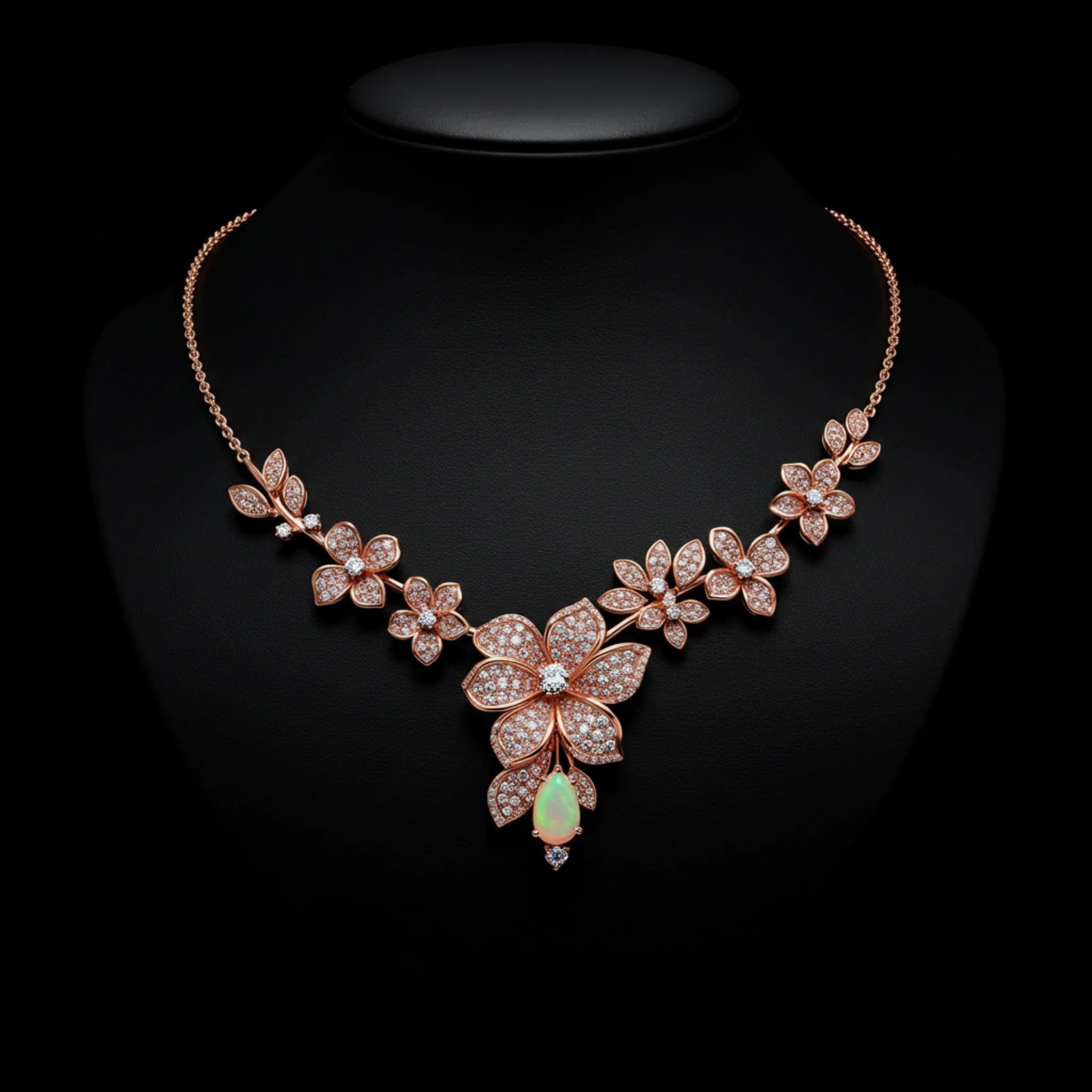 A singular floral masterpiece. Iridescent opal suspended in rose gold.