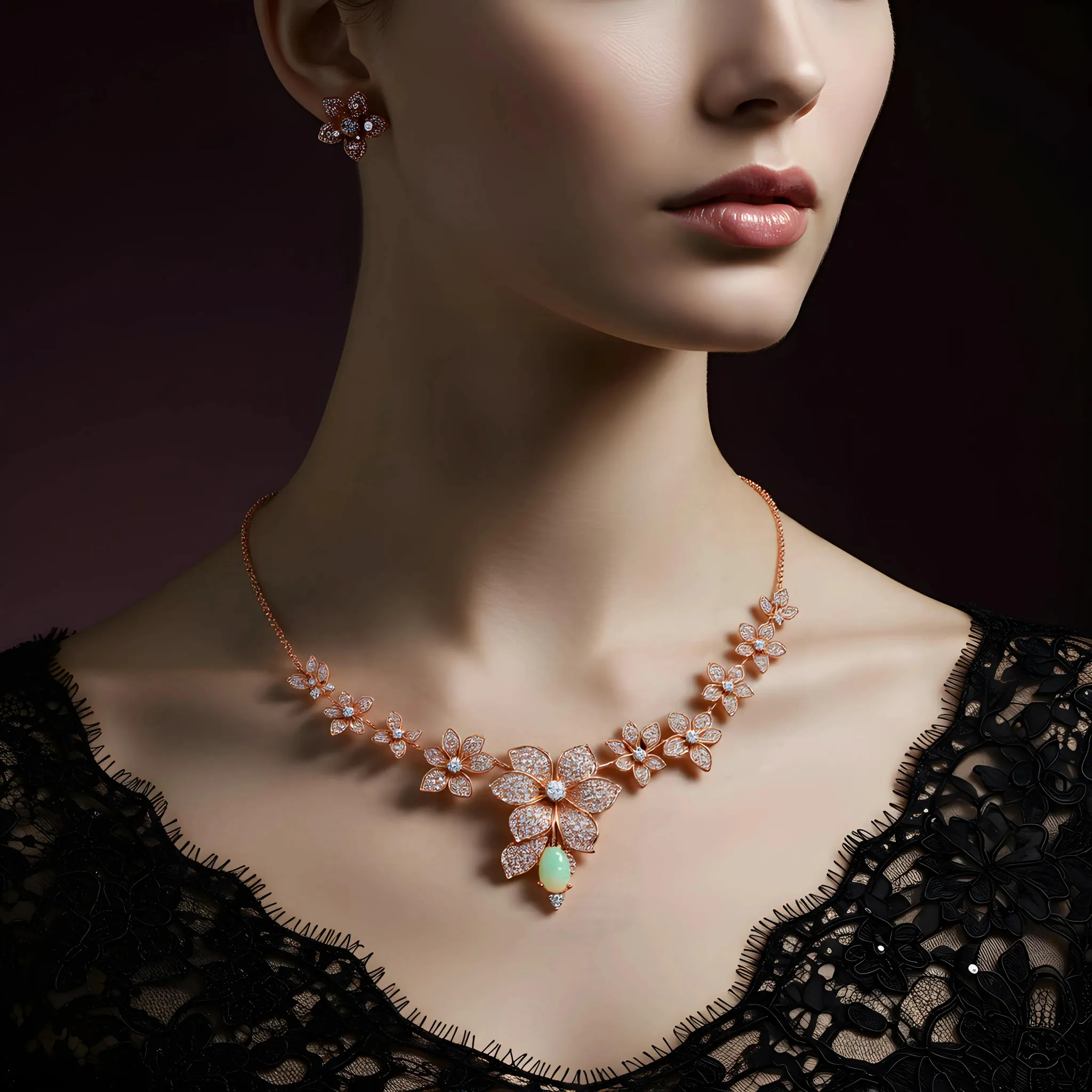The Enchanted Opal Bloom necklace is a sculptural interpretation of botanical fluidity. Crafted in 18k rose gold, the architecture centers an iridescent opal, framed by precision-set diamonds to capture the essence of a living flower. This piece functions as wearable art, balancing nature’s complexity with a refined, minimalist silhouette. It remains a one-of-a-kind acquisition for the collector who seeks rarity and structural elegance.
