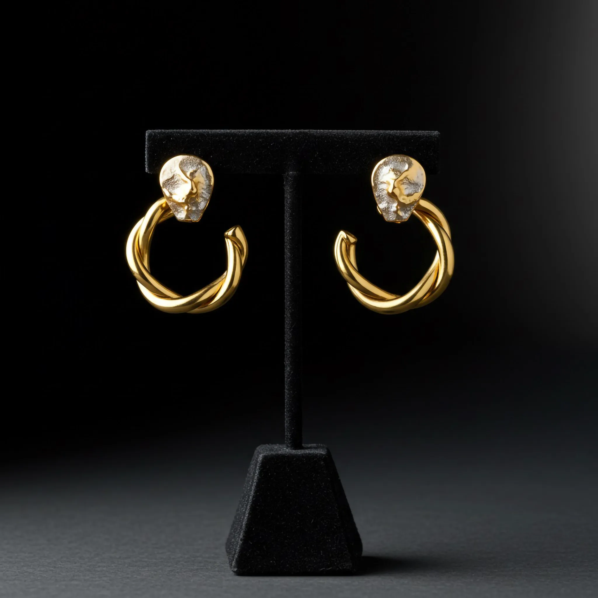 The Gilded Elegance earrings are a rigorous exploration of metalwork as art. Forged in solid 18k gold, the architecture centers on a sophisticated twisted ring silhouette, anchored by a hand-textured headpiece. By omitting gemstones, the design prioritizes the raw integrity of the gold and the interplay of light across its varying surfaces. It is a definitive acquisition for the collector who values disciplined minimalism and the assertive presence of high-jewelry craftsmanship.