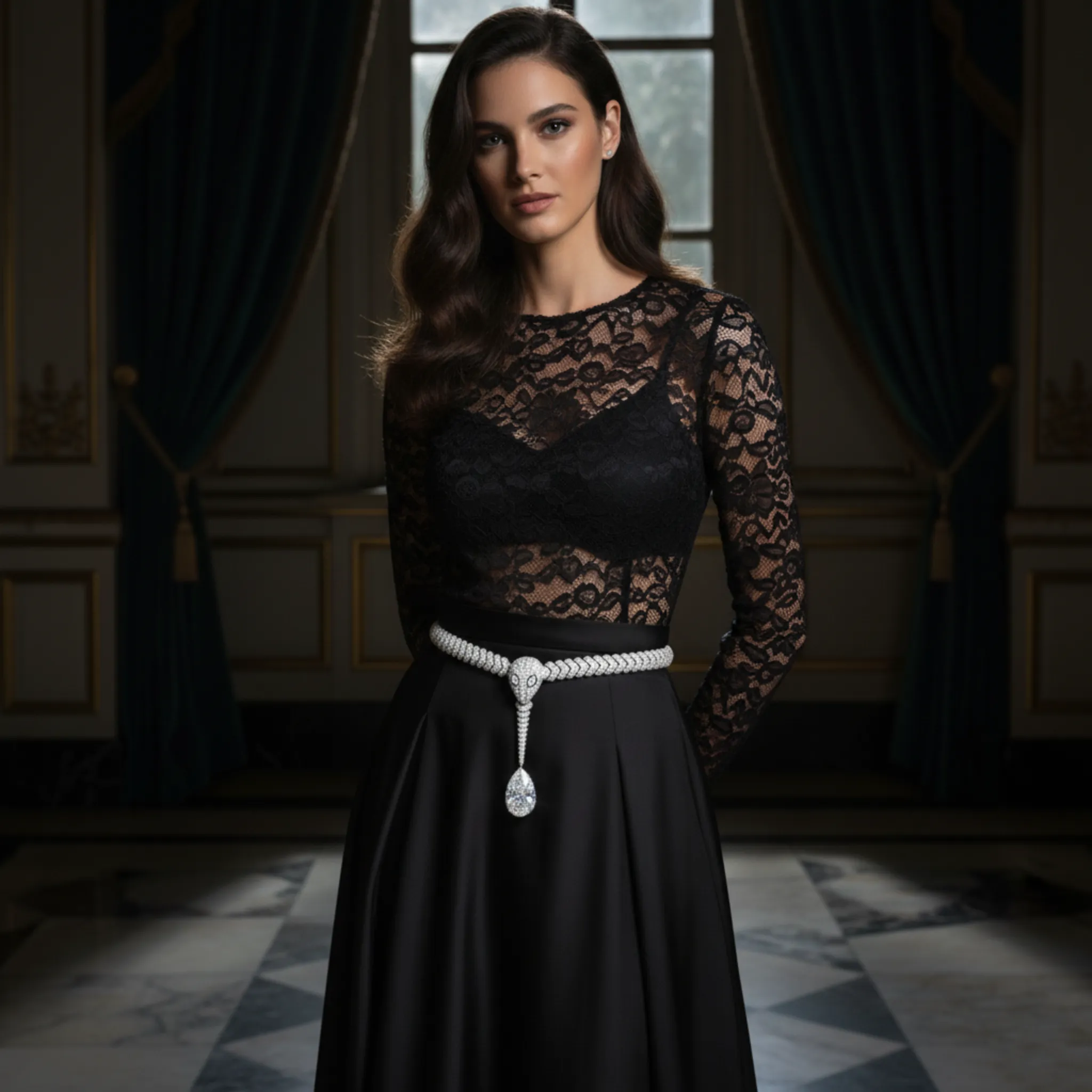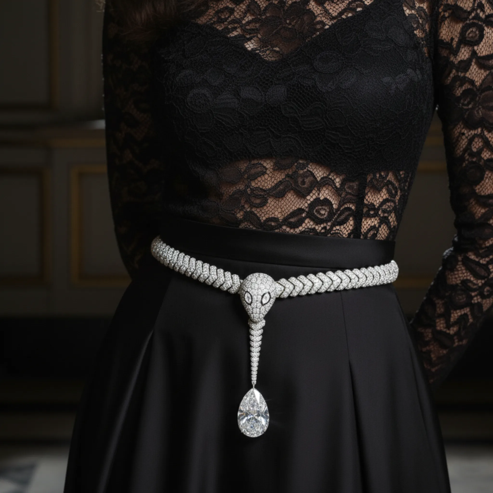 The Lumina Serpentis waist chain is a definitive fusion of modern art and high jewelry. Engineered in solid 18k white gold and punctuated by diamonds, its fixed-link architecture requires precise measurements for a seamless, bespoke fit. Unlike adjustable counterparts, this piece maintains a rigorous, uninterrupted silhouette that contours the body with mathematical accuracy. It is a refined statement of exclusivity, designed for the collector who demands absolute structural integrity.