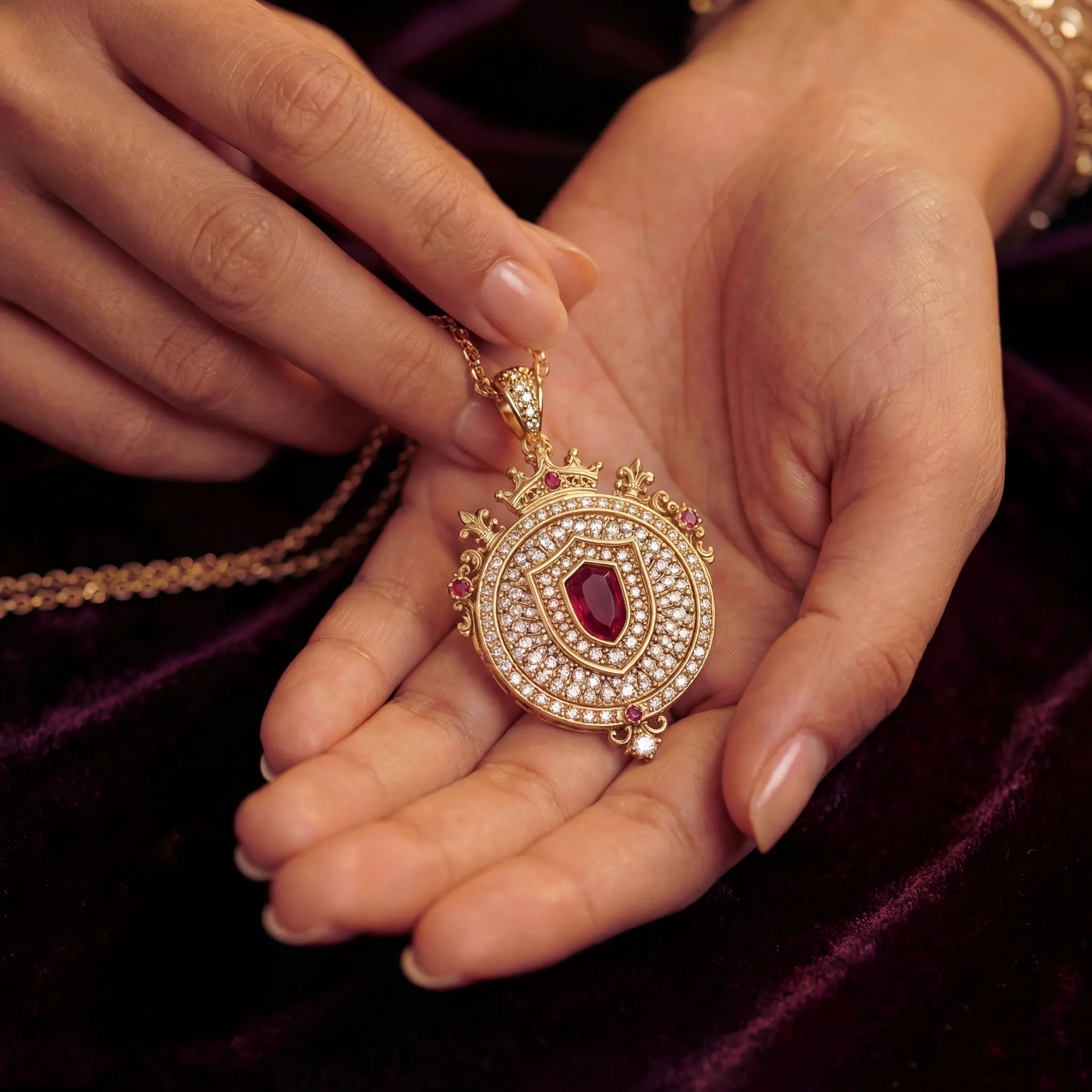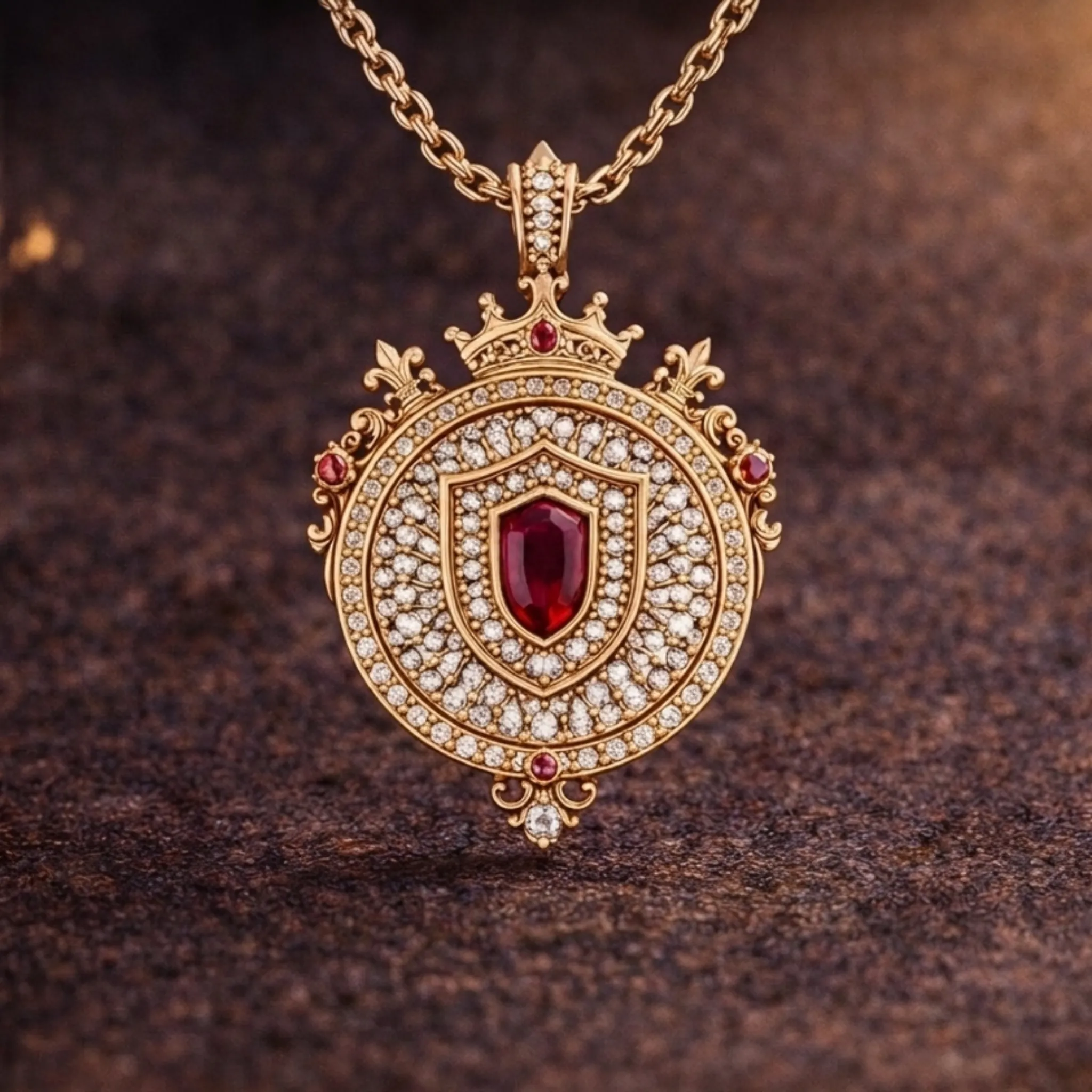 Sovereign defiance. A 22k gold icon defined by deep ruby and light.