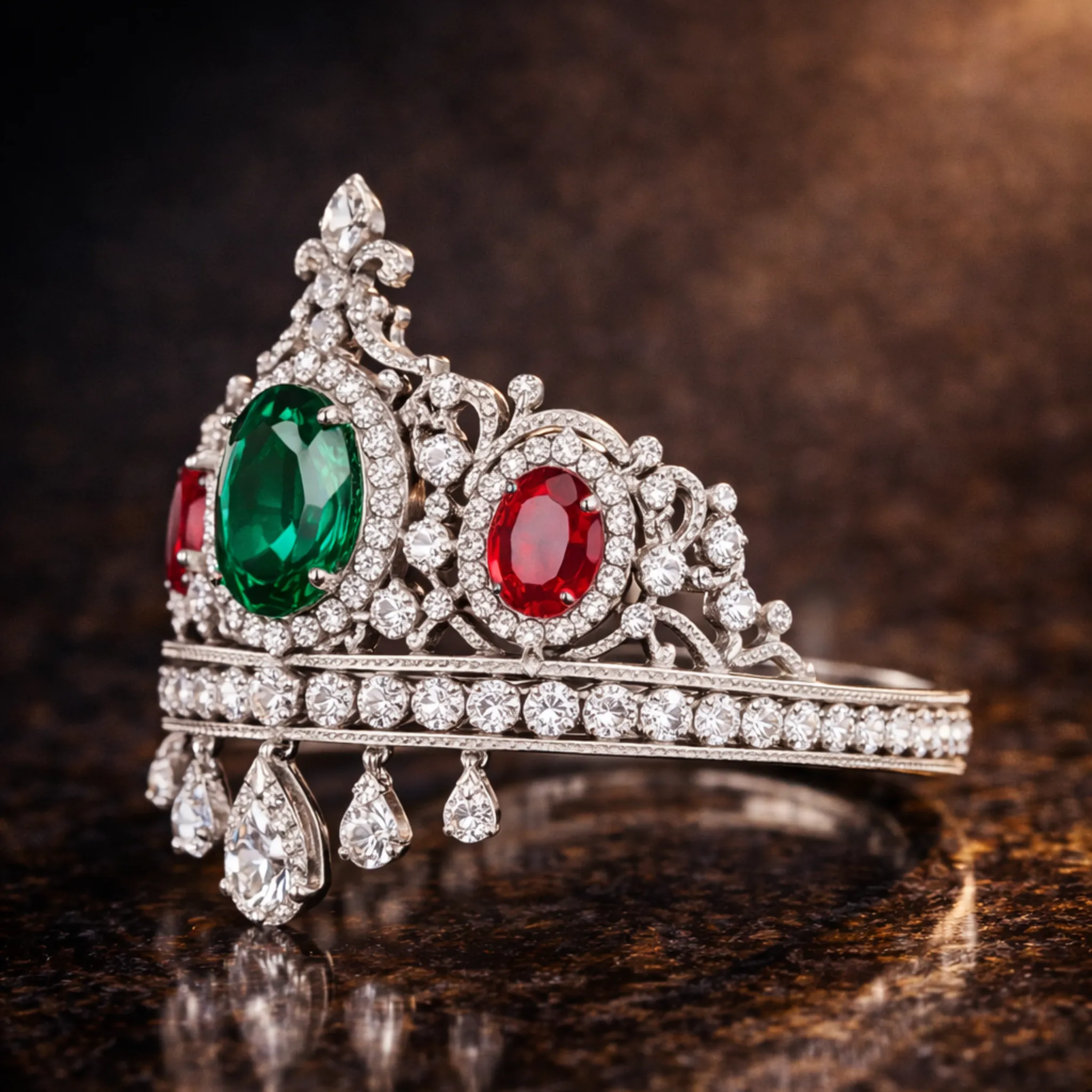 The Sovereign Crown Ring is an architectural hybrid of the traditional signet and the royal crest. Cast in solid platinum, its raised profile serves as a definitive signifier of heritage and status for the global elite. The design centers a precision-cut emerald or ruby, framed by disciplined diamond accents. It is a substantial, commanding piece engineered for those who inhabit the highest tiers of influence.
