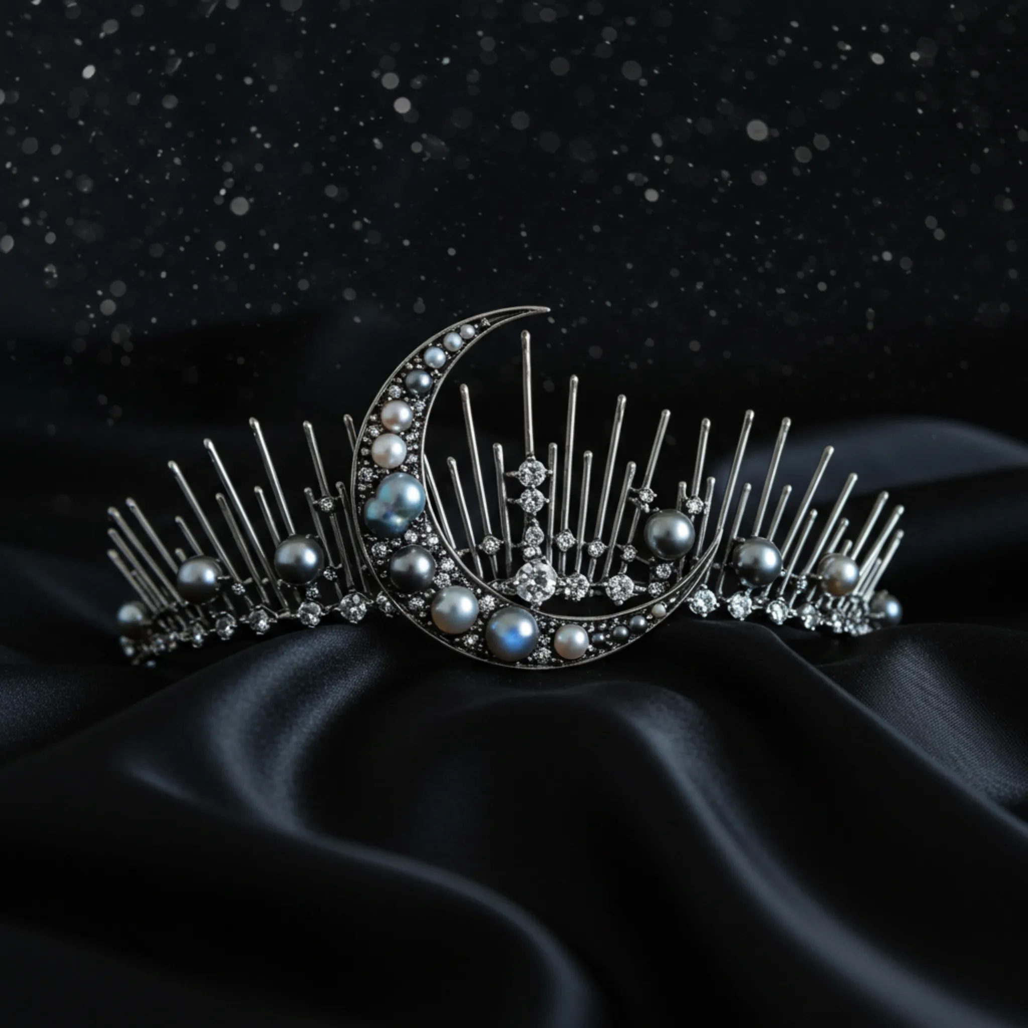 Darkness refined. A raw platinum silhouette anchored by singular natural pearls.