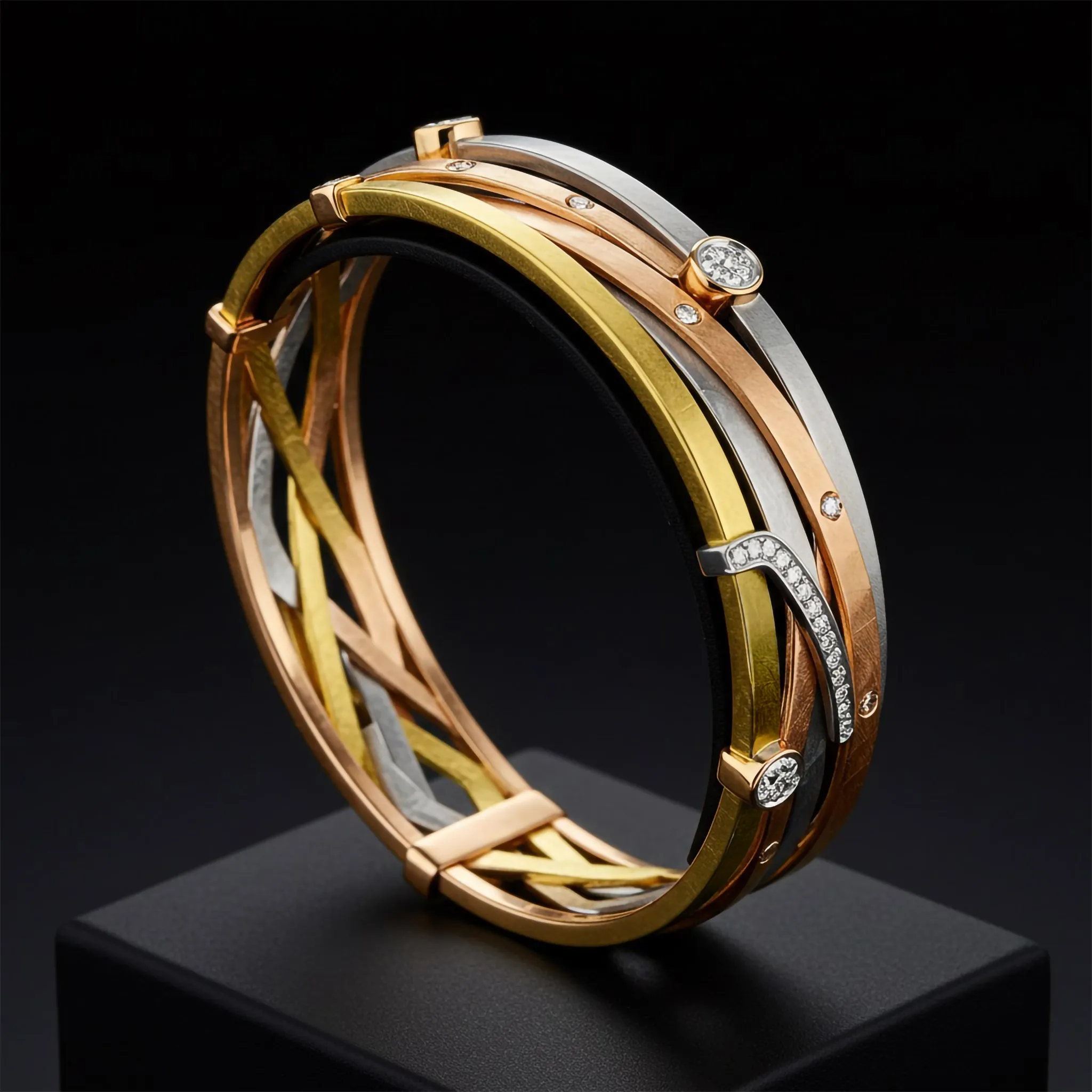 The Trinity Luxe bracelet unites 18k yellow, white, and rose gold in an exacting, interlocking architecture. This tri-tone composition functions as a study in balance and geometric precision, elevated by meticulously set diamonds. By converging three distinct metal signatures into one seamless form, it presents a sculptural statement of fine art. Designed for the collector who demands both complexity and restraint.